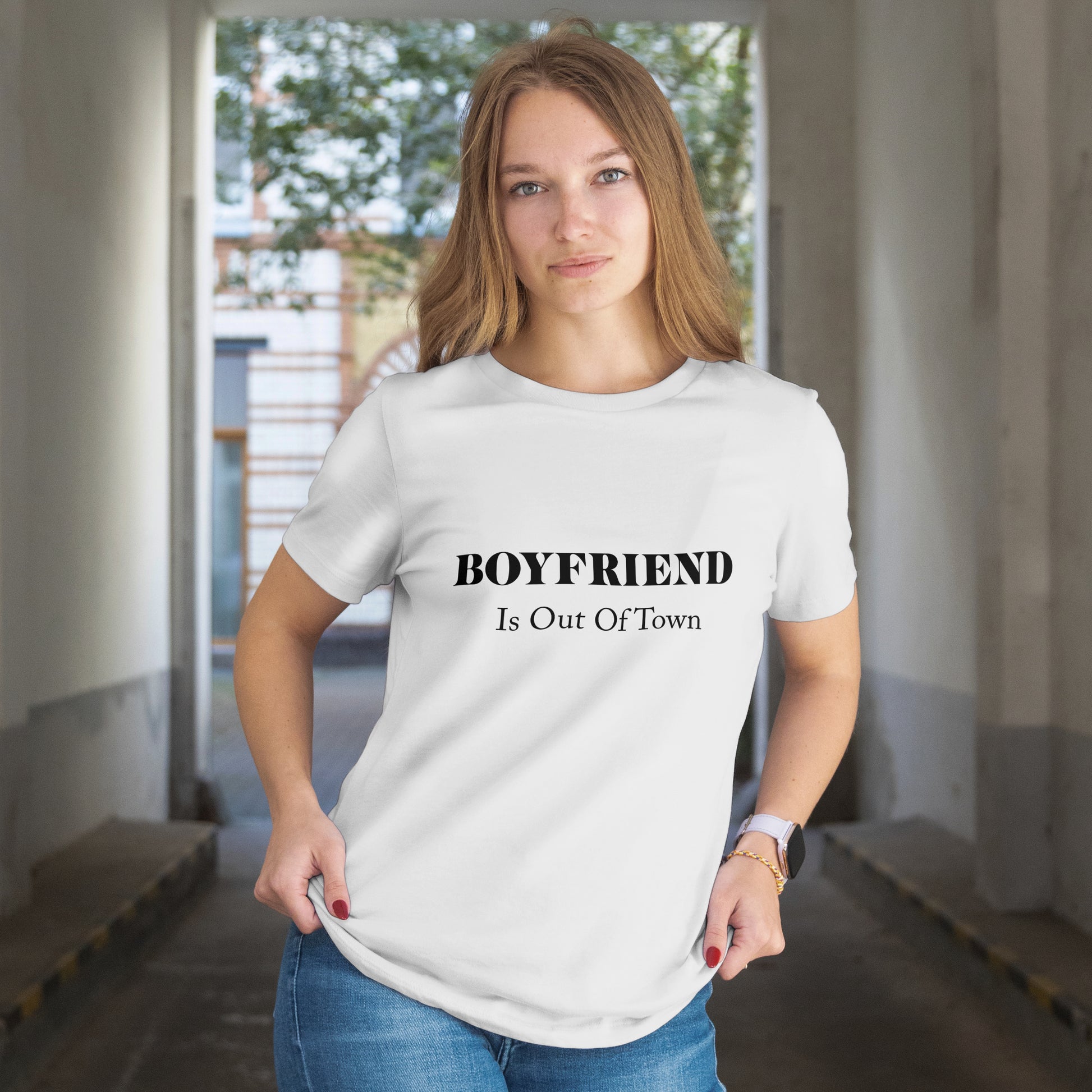 Flirty, fun, and full of attitude—this tee says it all. With the phrase "Boyfriend Is Out Of Town" boldly printed on the front, it's made to turn heads and spark conversation. Crafted from ultra-soft 4.3 oz 100% cotton, it delivers lightweight comfort with a playful edge. Whether you're out with friends or just feeling cheeky, this shirt is the perfect blend of sass and style. Wear it loud, wear it proud, and let the message do the talking.