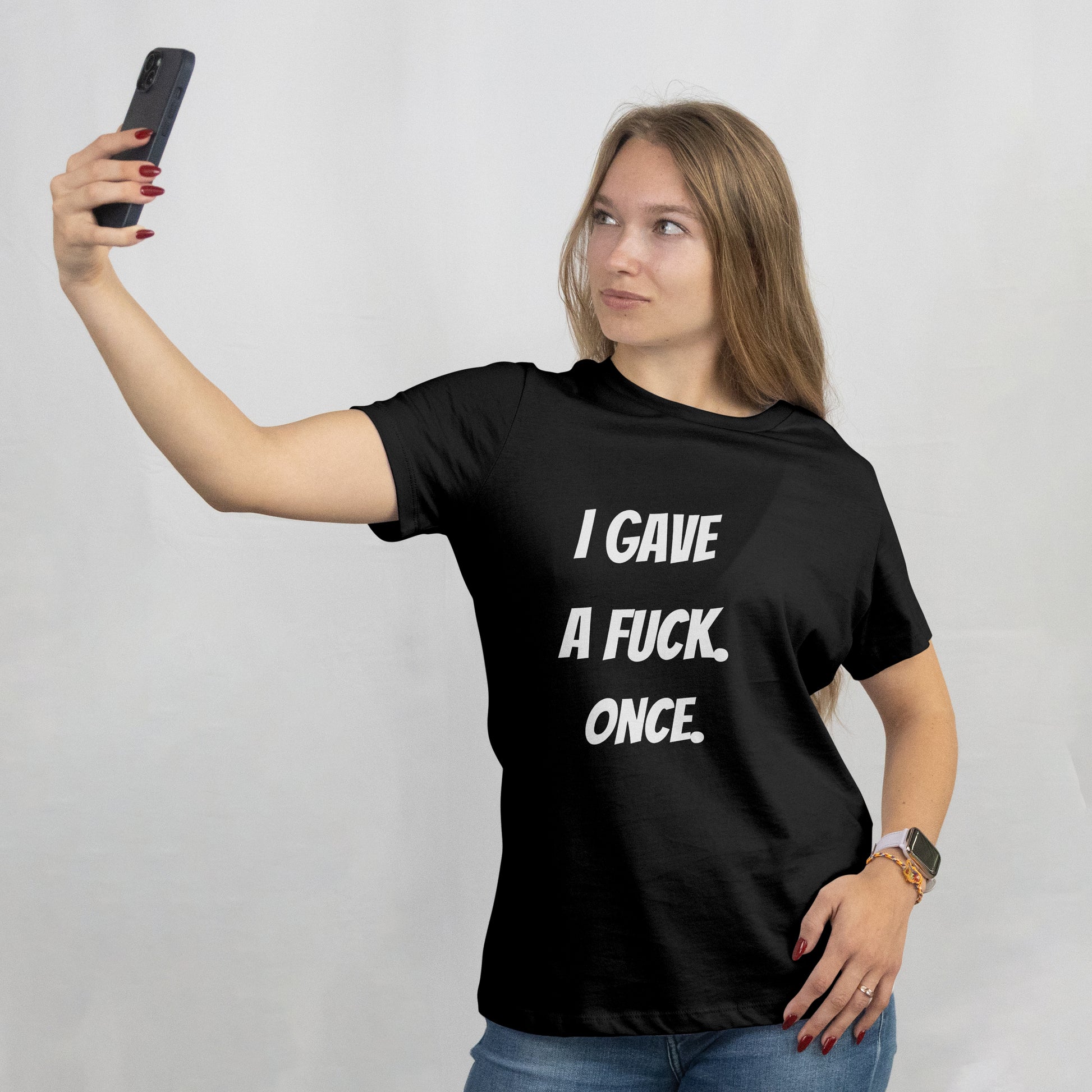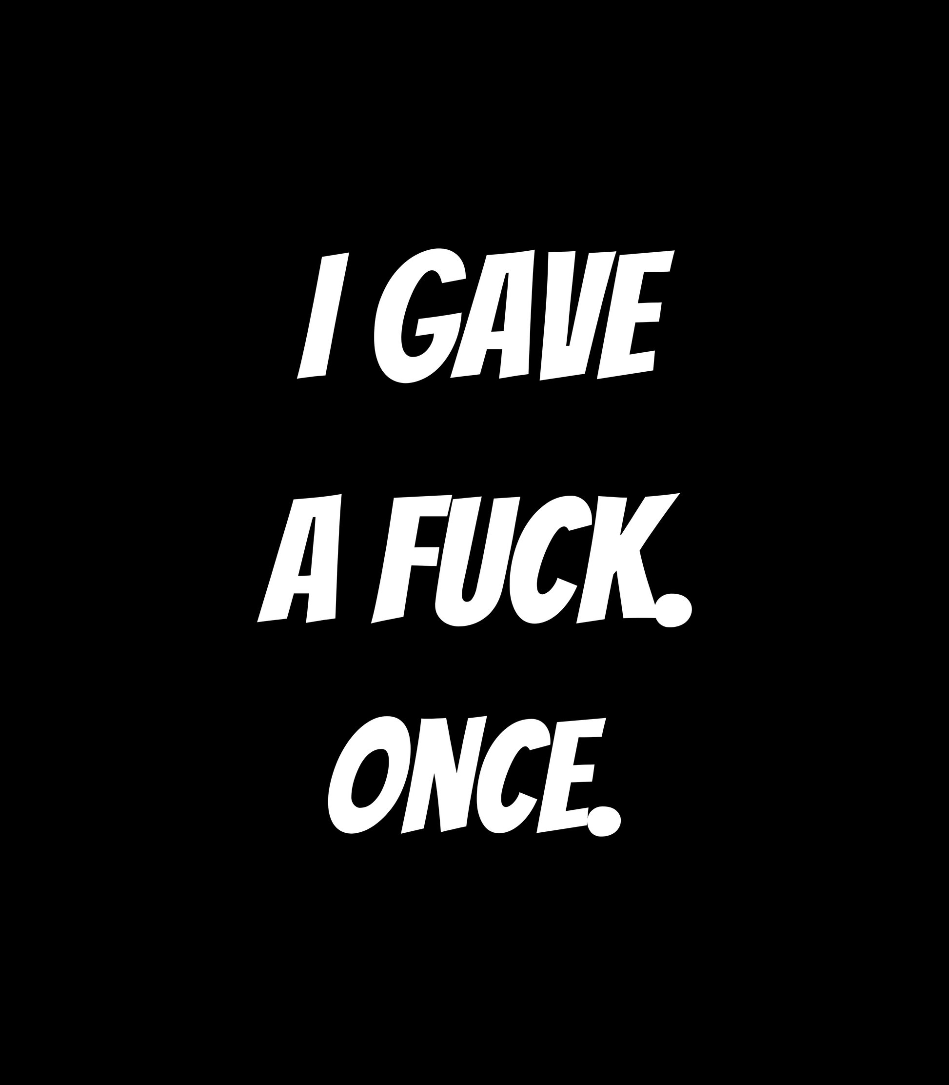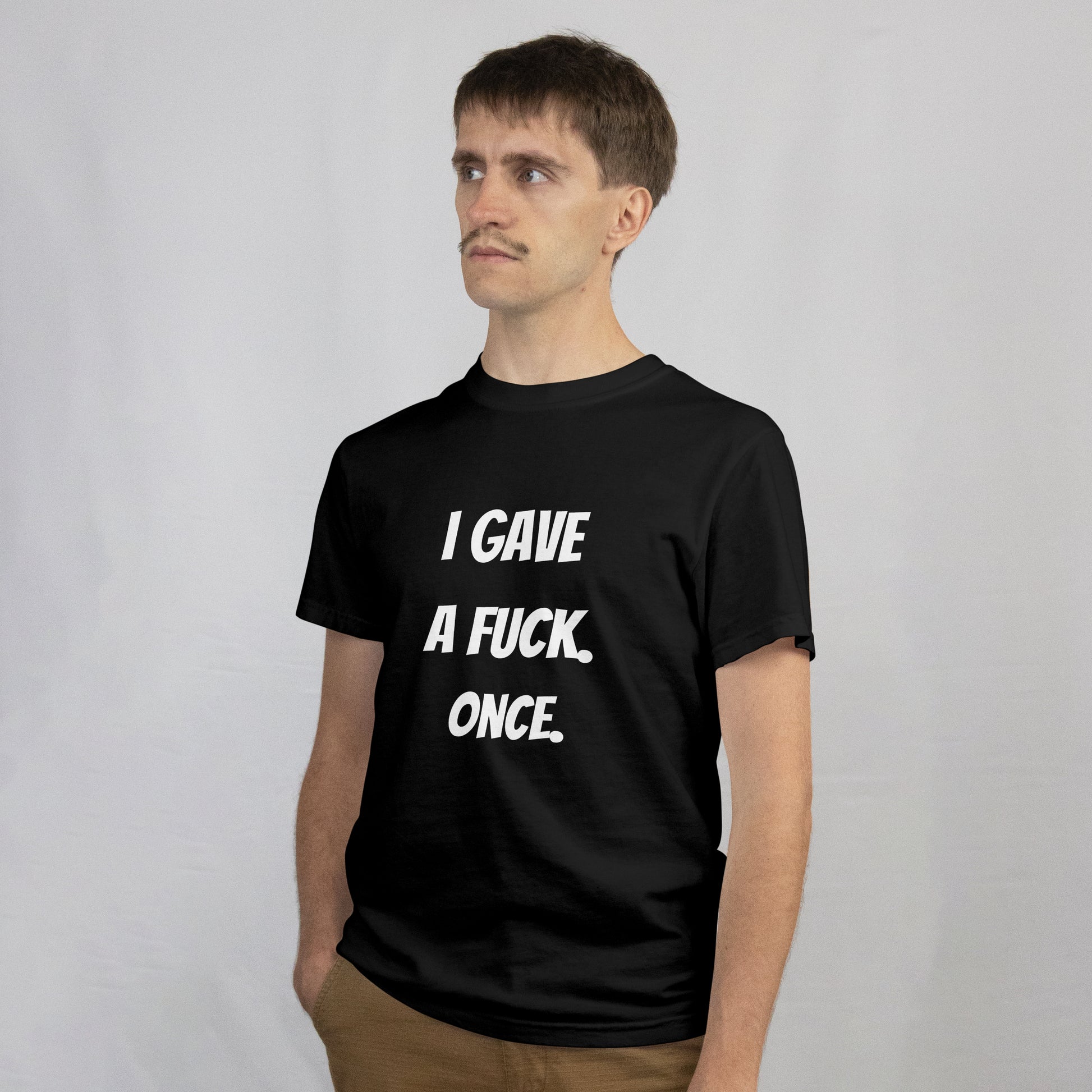 Make a bold statement without saying a word. This unapologetic tee features the phrase "I Gave A Fuck Once" printed front and center for those who are done caring and proud of it. Made from lightweight 4.3 oz 100% cotton, it offers a soft, breathable feel with just the right amount of edge. Whether you're embracing your inner rebel or just having one of those days, this shirt delivers attitude, comfort, and a healthy dose of not-giving-a-damn.
