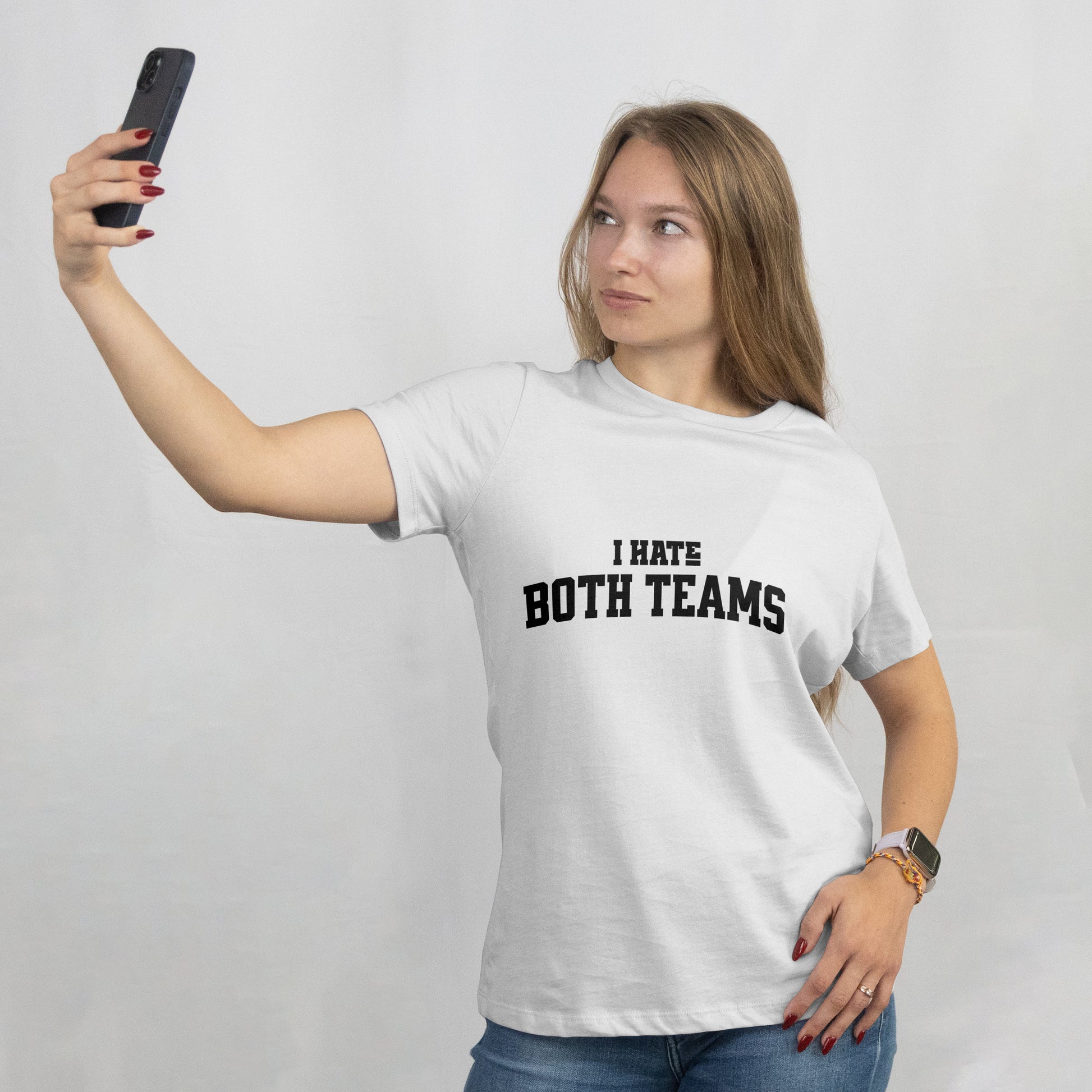 Not here to pick sides—just here for the snacks and the drama. This tee features the hilariously blunt phrase "I Hate Both Teams" on the front, perfect for sports skeptics, neutral parties, or those who just enjoy stirring the pot. Made from lightweight 4.3 oz 100% cotton, it’s soft, breathable, and built for all-day comfort—whether you’re at the game, at a party, or just watching to criticize the refs. The perfect shirt for people who came for the chaos, not the competition.