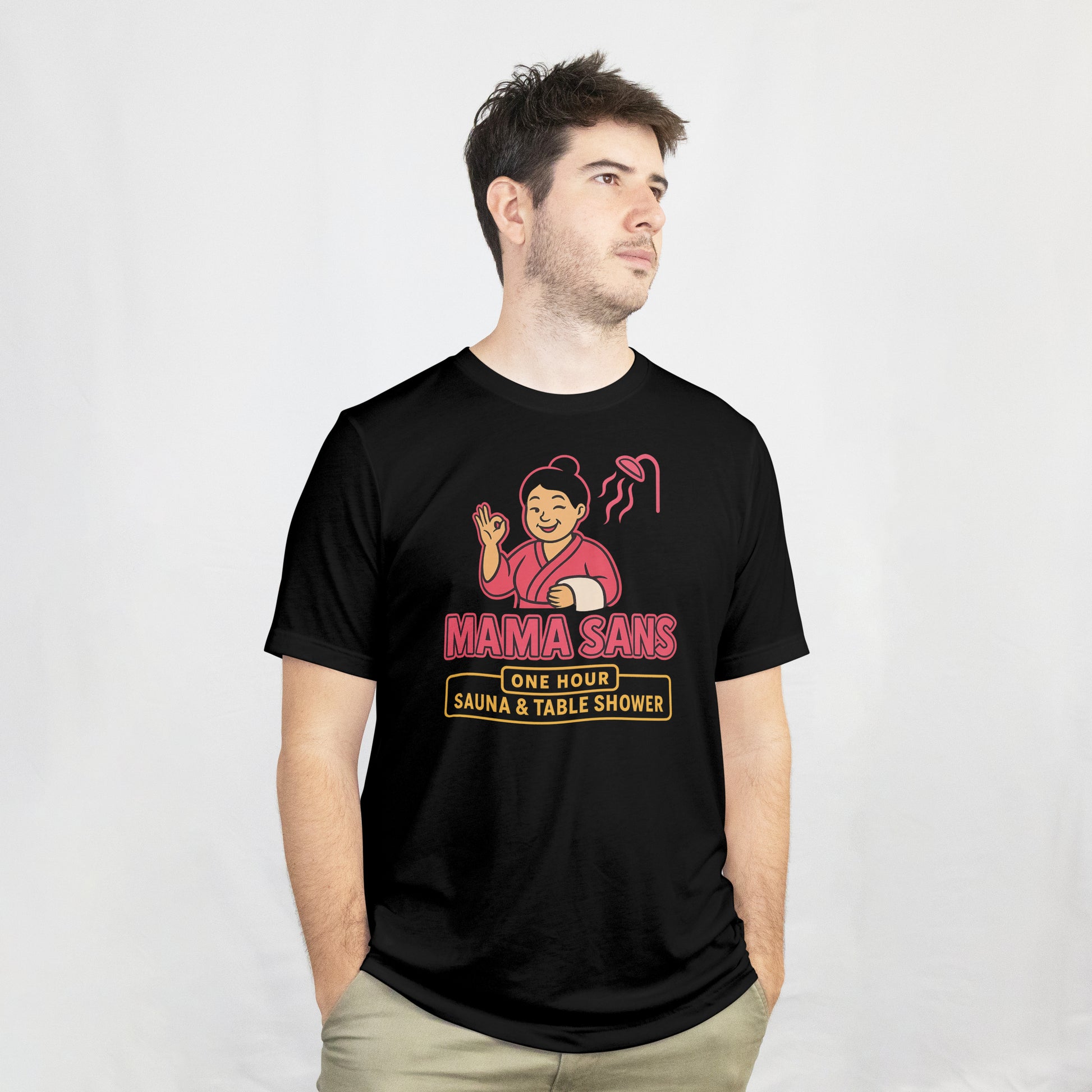 Meet Mama Sans—the larger-than-life character brought to life from Jason Vest’s Story Time. This shirt takes the legend up a notch, featuring Mama San herself as the focal point, paired with the bold text One Hour Sauna & Table Shower.