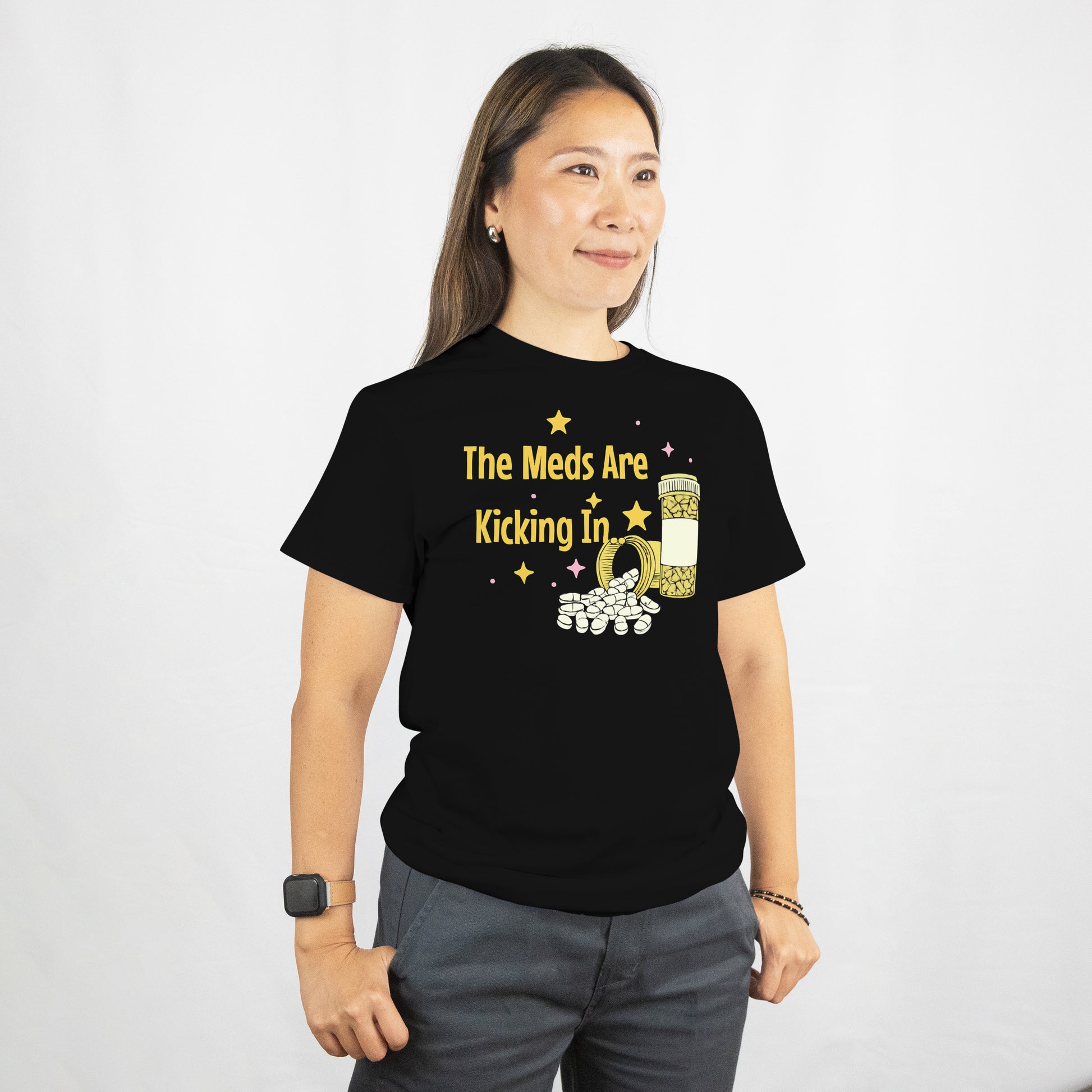 For those moments when the day starts to mellow out—this tee says it all. Featuring the playful phrase "The Meds Are Kicking In" across the front, it’s perfect for fans of dark humor and unapologetic honesty. Crafted from lightweight 4.3 oz 100% cotton, this shirt delivers soft, breathable comfort with a punchline that lands every time. Whether you're winding down, tuning out, or just embracing the vibe, this tee brings laughs and laid-back style in equal measure.