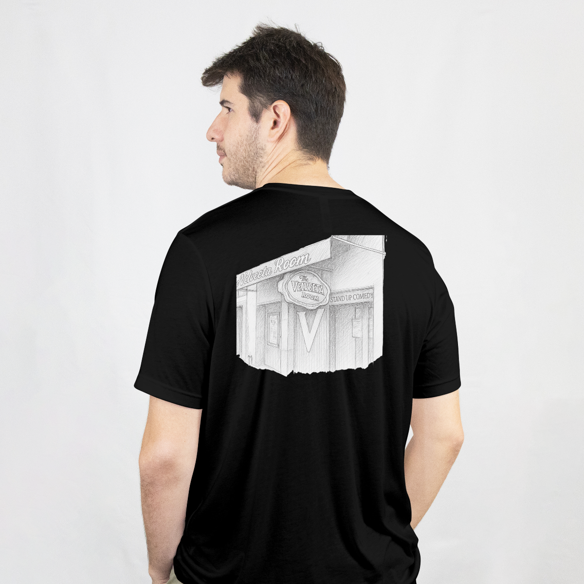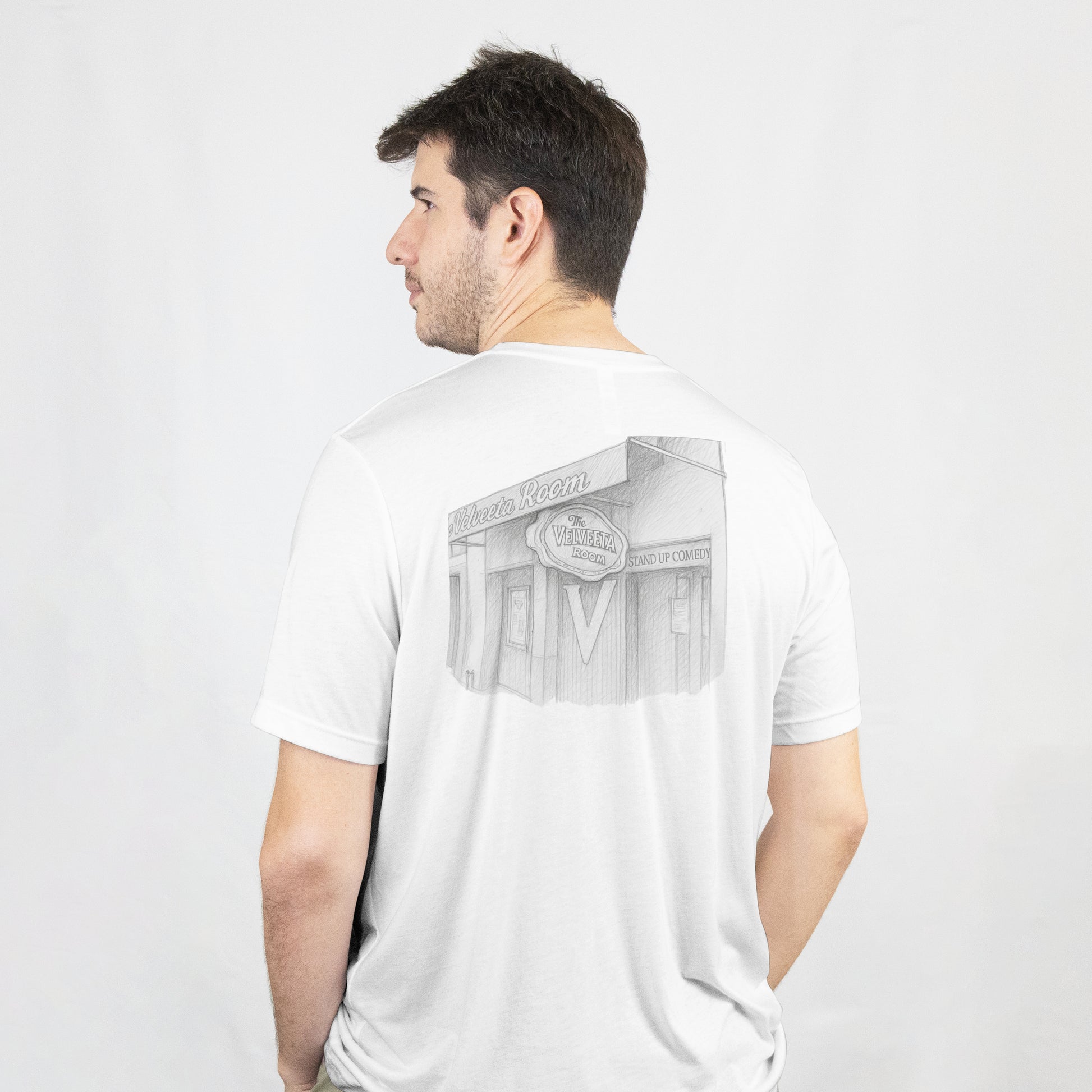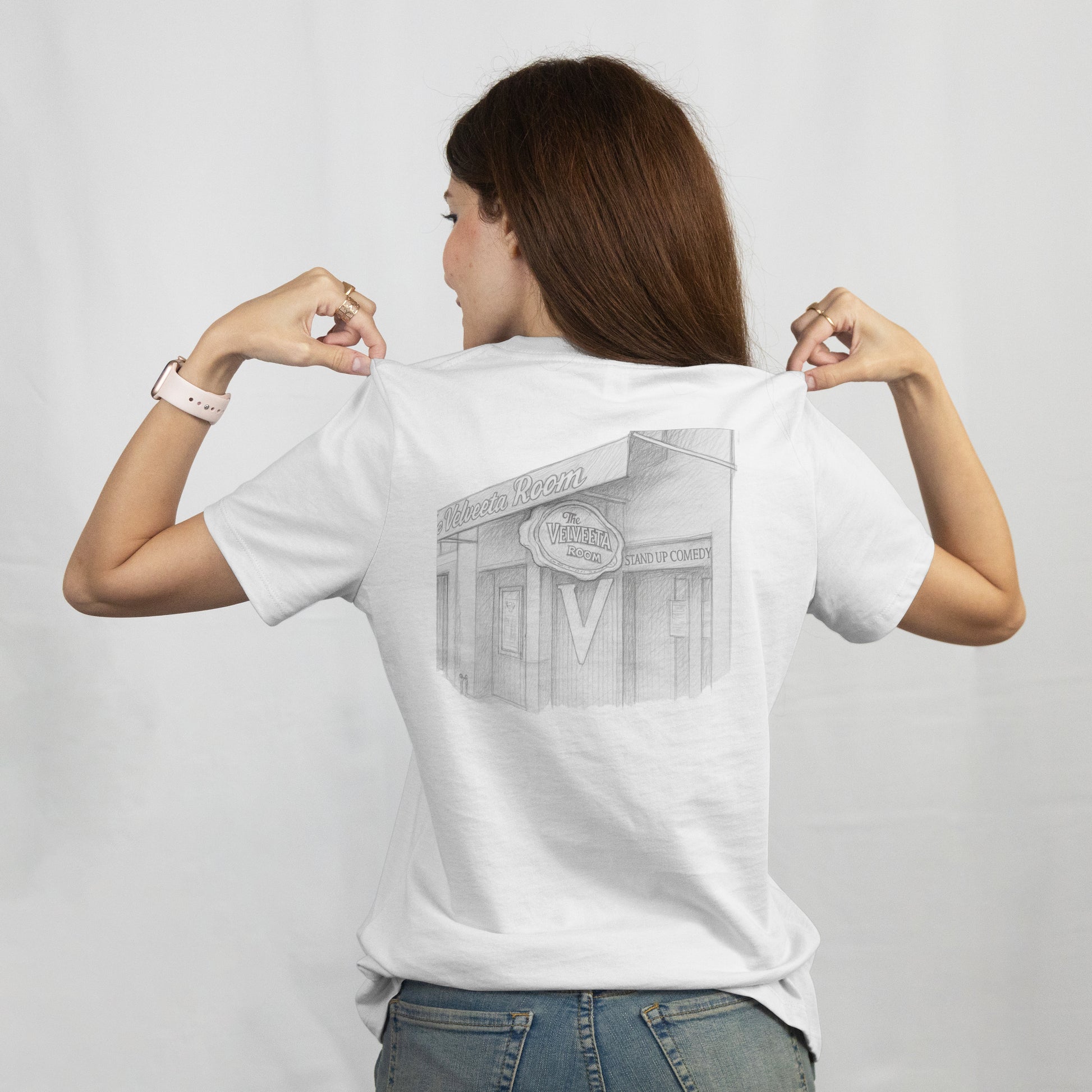 This shirt pays tribute to the longest-running comedy club in Austin with a design that’s both subtle and timeless. On the front, the iconic Velveeta Room sign sits on the left chest—simple, clean, and instantly recognizable. On the back, a classic pencil-drawn style illustration captures the club’s exterior on 6th Street, a spot that’s been a landmark for generations of comics and fans.
