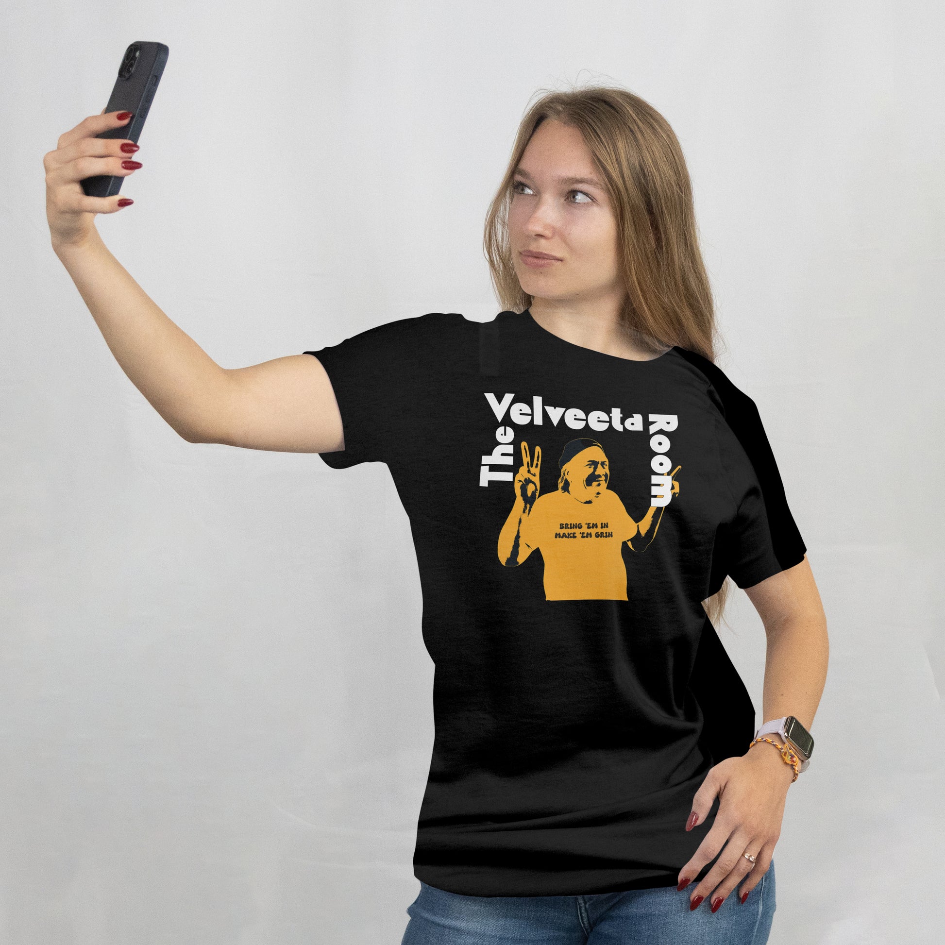 To tie it all together, the shirt features the fitting slogan: “Bring ’em in, make ’em grin.” It’s a perfect nod to Park’s spirit and the Velveeta Room’s place in Austin comedy history. Printed on a soft, high-quality tee, this is more than merch — it’s a piece of comedy culture you can wear.