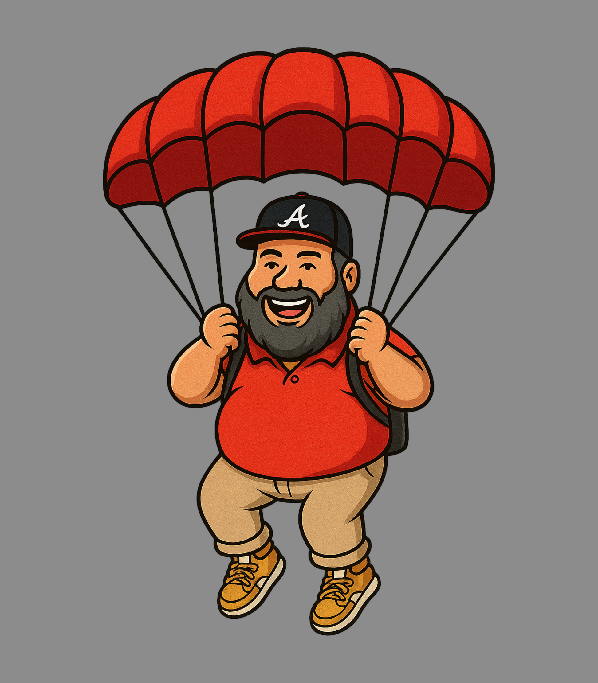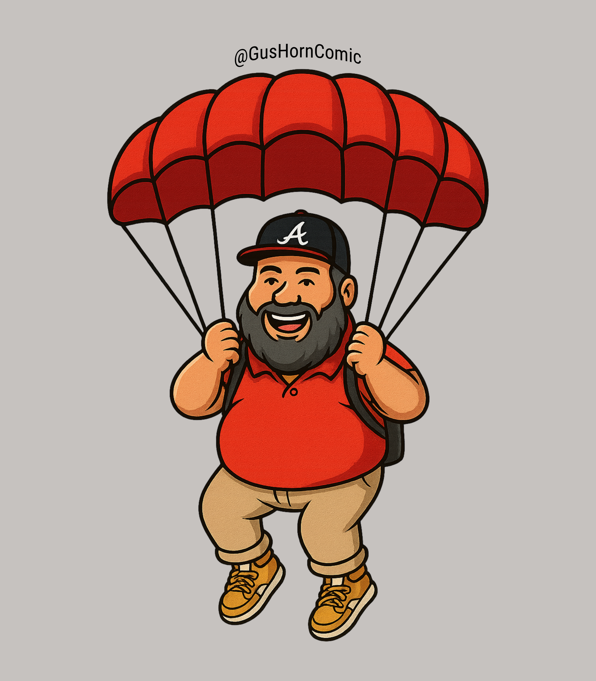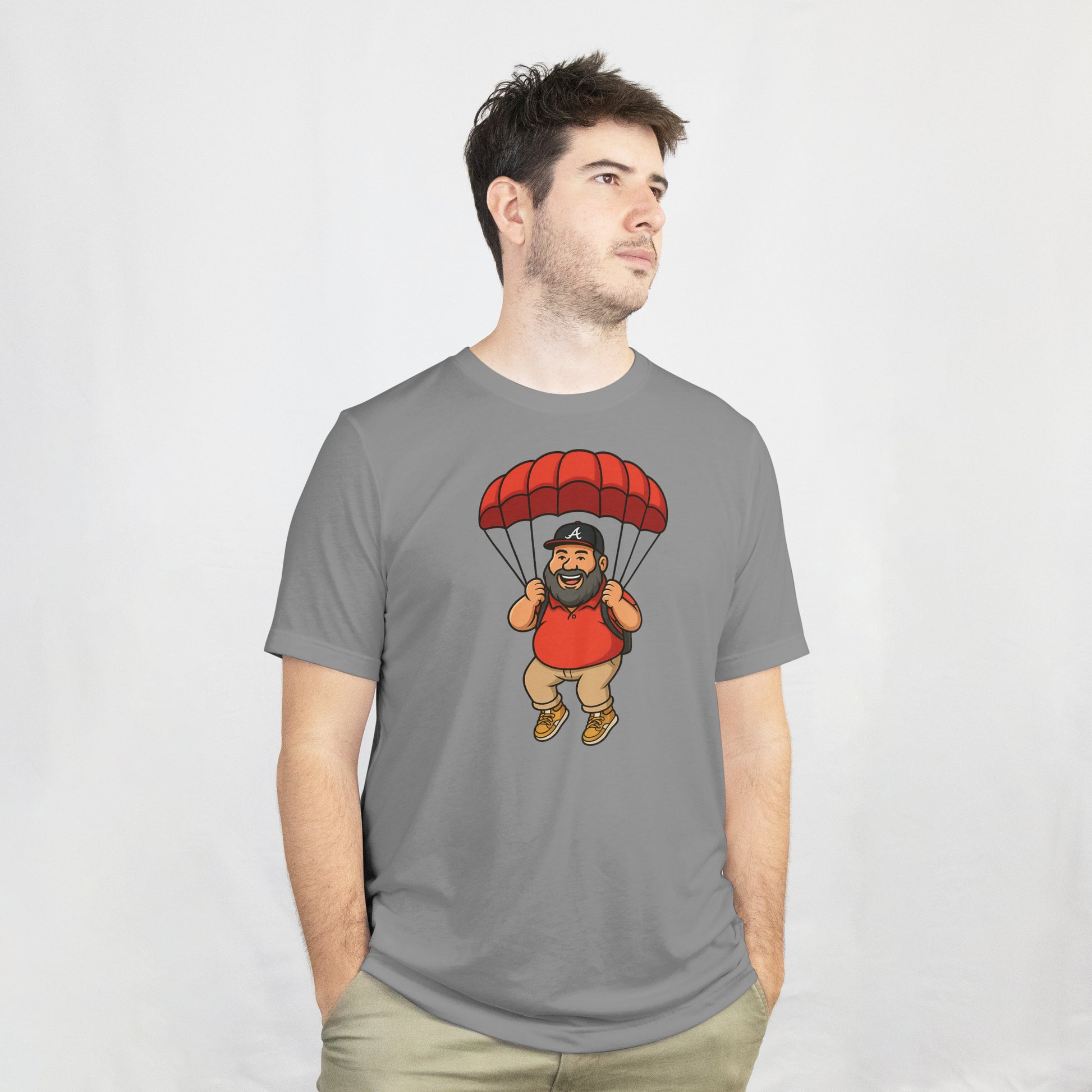 Straight from his Kill Tony set, this shirt brings Gus Horn’s skydiving bit to life in character style. The design features Gus himself—parachute overhead, rocking his trademark Atlanta Braves cap—capturing his dream of taking the leap (twice!) once he’s no longer “too fat for gravity.”